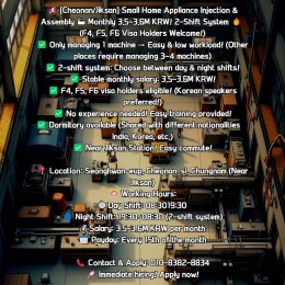 천안/직산] 소형 가전제품 사출 & 조립 ???? 월 350~360만 원! 2조 2교대 ???? (F4, F5, F6 비자 가…