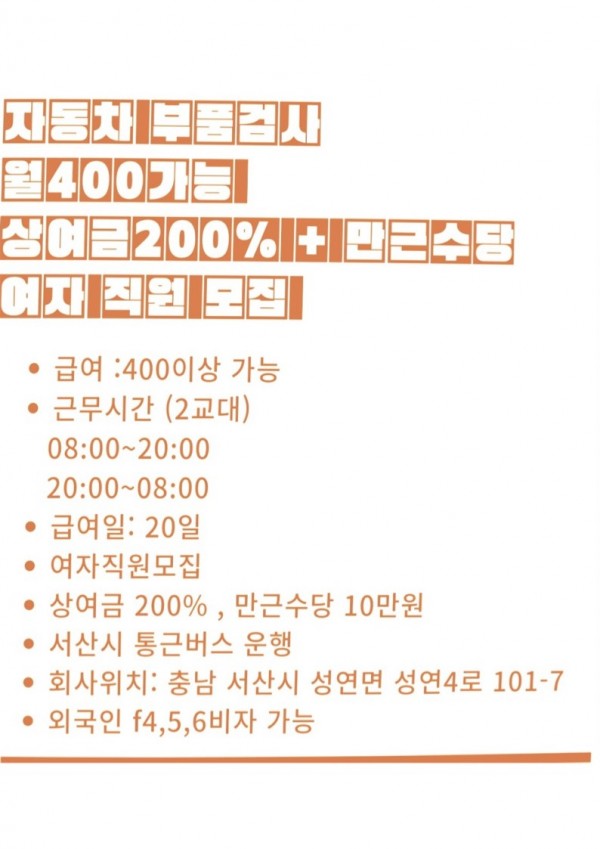 * 상여금 200% +만근수당 10만원/ 여자 직원 모...